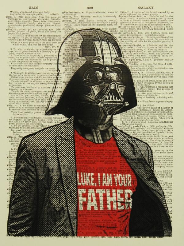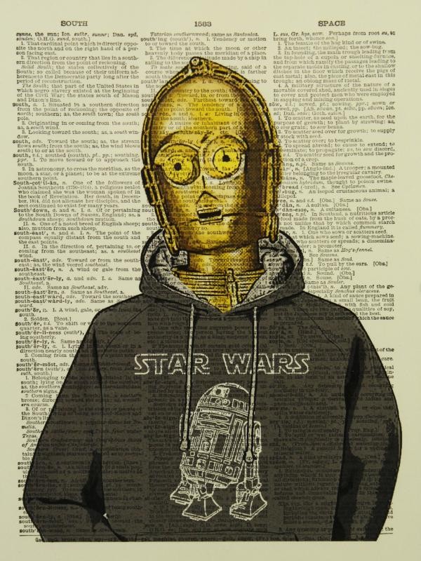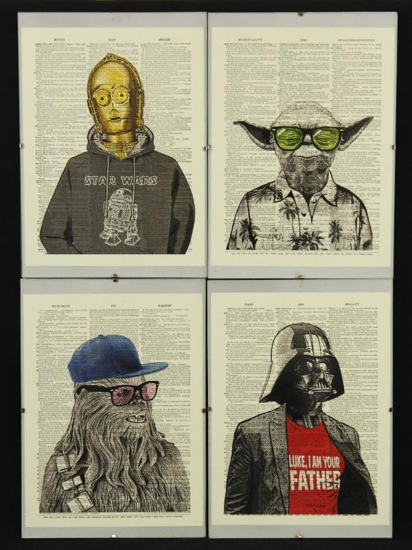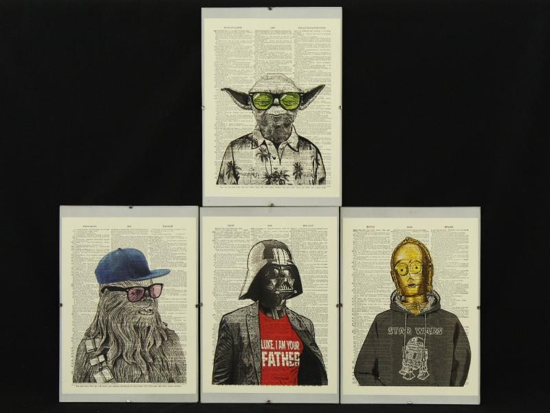 Unieke set van vier ingelijste art prints in Star Wars-stijl, telkens met een humoristische en vintage toets. De werken zijn gedrukt op stevig papier met als achtergrond een oude print van een woordenboek-/encyclopediepagina/StarWarspagina, waarin iconische figuren op een verrassende manier zijn weergegeven. Deze art prints combineren popcultuur met een vintage uitstraling, en brengen een speelse knipoog naar de klassieke saga. Het contrast tussen de iconische figuren en hun onverwachte outfits maakt deze prints uniek en humoristisch. Perfect om een vleugje popcultuur en vrolijkheid aan je interieur toe te voegen – en tegelijk een echte blikvanger voor Star Wars-fans én liefhebbers van originele kunst.