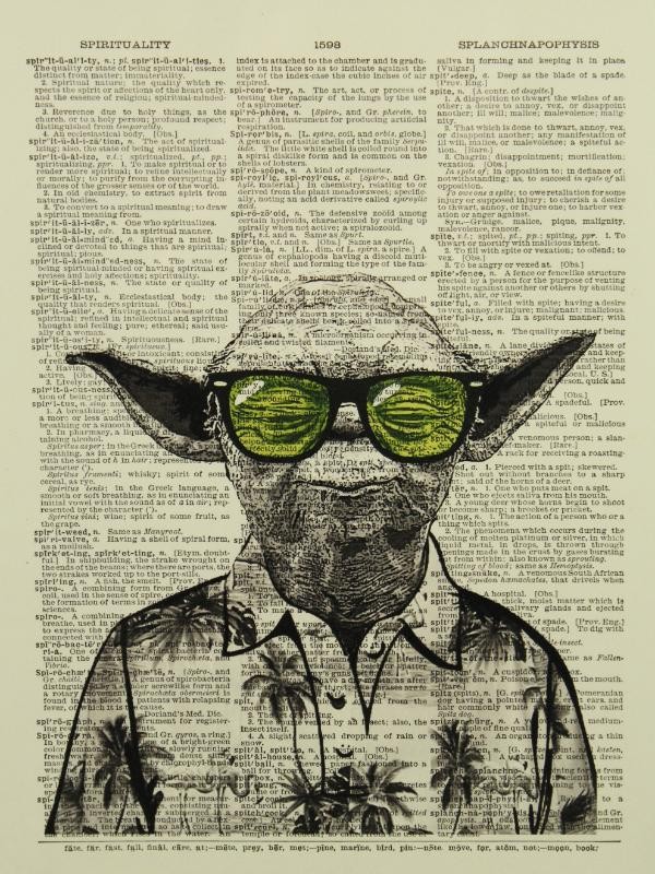 Yoda met felgroene zonnebril en zomers hemd met palmbomen.
