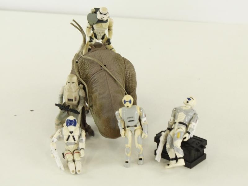 Dit lot bestaat uit een uitgebreide en gevarieerde verzameling Star Wars speelgoedfiguren en voertuigen, uitgevoerd in kunststof en gekenmerkt door een speelse en herkenbare sci-fi uitstraling. Het geheel omvat een mix van personages, robots (droids), voertuigen en accessoires. De figuren stellen voornamelijk mannelijke personages voor en zijn allen gekleed in typische Star Wars outfits zoals gewaden, harnassen, pilotenkledij en gevechtsuitrusting. De kleuren variëren van wit, beige en bruin tot zwart en grijstinten, met hier en daar accenten in blauw en andere kleuren. De details zoals riemen, laarzen, helmen en vesten zijn fijn uitgewerkt en geven elk figuur een eigen karakter. Daarnaast zijn er meerdere robots (droids) aanwezig, herkenbaar aan hun mechanische vormen en beweeglijke ledematen, uitgevoerd in lichte zandkleurige en ivoortinten met donkere accenten. Deze zorgen voor een mooi contrast met de menselijke figuren en versterken het typische Star Wars karakter van het lot.
