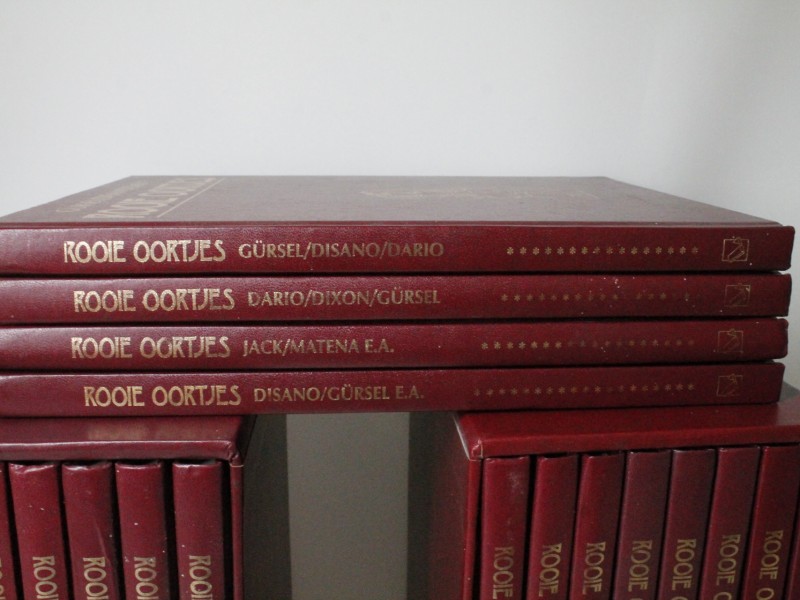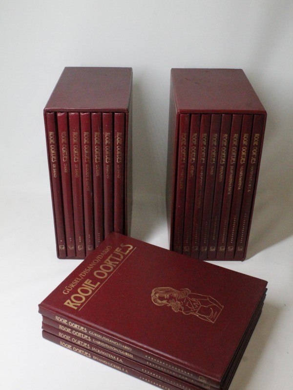 Een stripreeks van "Rooie Oortjes" Een verzameling van 19 boeken van een populaire Belgische reeks erotische stripverhalen voor volwassenen. De kaft is een speciaal gebonden, rode kunstleren editie met gouden opdruk. Deze collectie bevat een selectie van klassieke en nieuwe eortische gags getekend door verschillende artiesten.