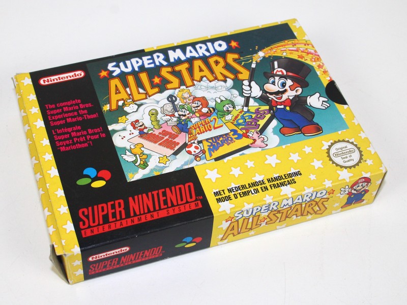 Game voor de Super Nintendo in de originele doos: Super Mario All Stars uit 1993.