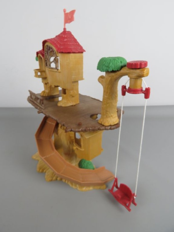 Het is een stevige plastic speelset die een grote, knoestige boom en een houten boomhut voorstelt.