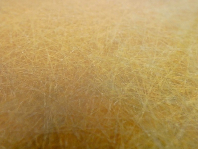 Het materiaal heeft een gele/beige basiskleur en een transparante glanzende afwerking.