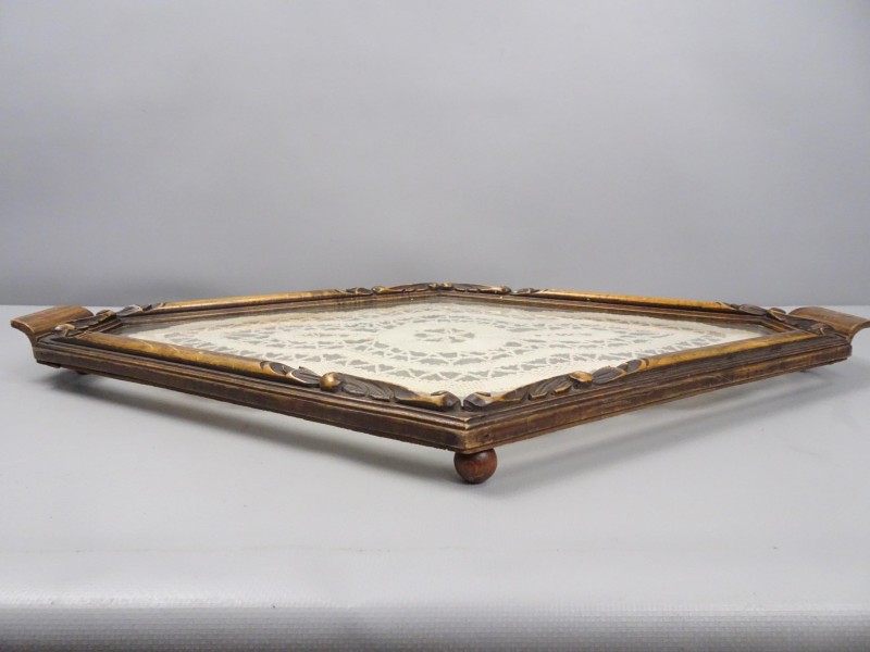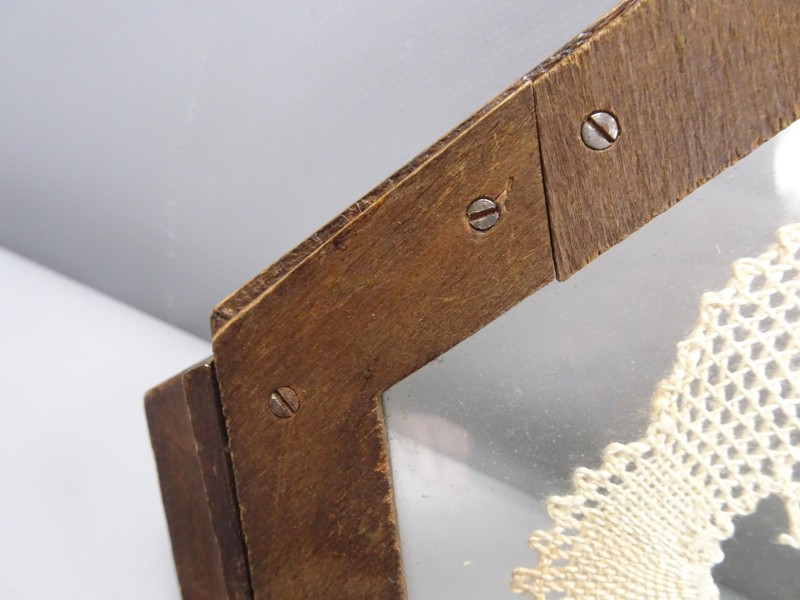 Dit kantwerk is ingelijst in een houten kader met pootjes. Onderaan is er een bars in het hout.