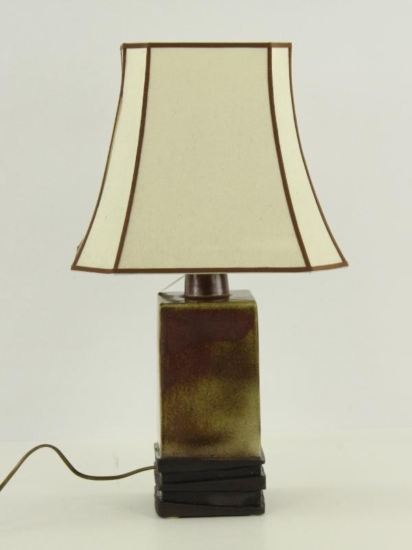 Tafellamp met rechthoekige basis uit keramiek, geglazuurd met een groenbruin glazuur. Op de lampenvoet staat een stoffen lampenkap in zachte, witbeige tint met bruine sierlijke biezen. De lamp is onderaan gesigneerd met het monogram 'EL'.