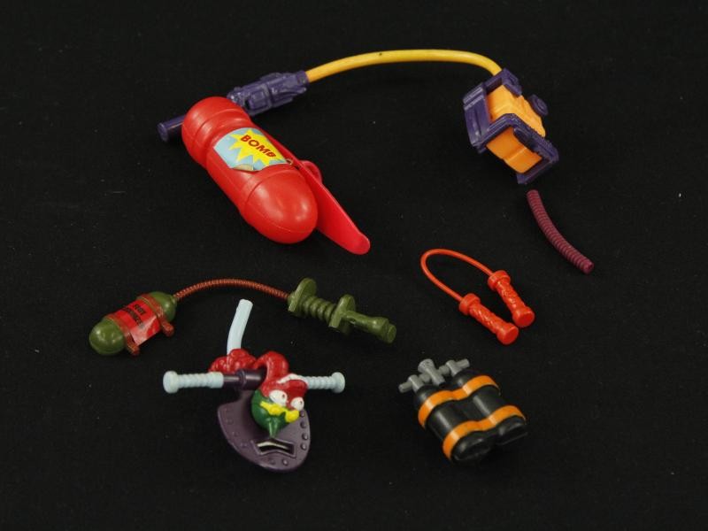 - Extra accessoires en losse onderdelen, waaronder wapens, bommen en andere kenmerkende stukken die bij de figuren horen.