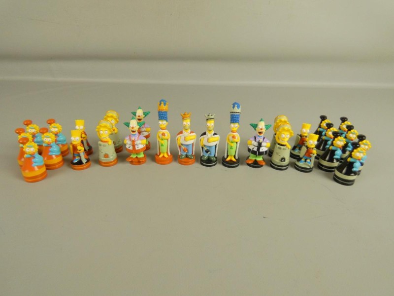 Figuren: Alle belangrijke personages (Homer, Marge, Bart, Lisa, Krusty, e.a.) in hun rol als schaakstukken (koning, dame, loper, paard, toren, pion).