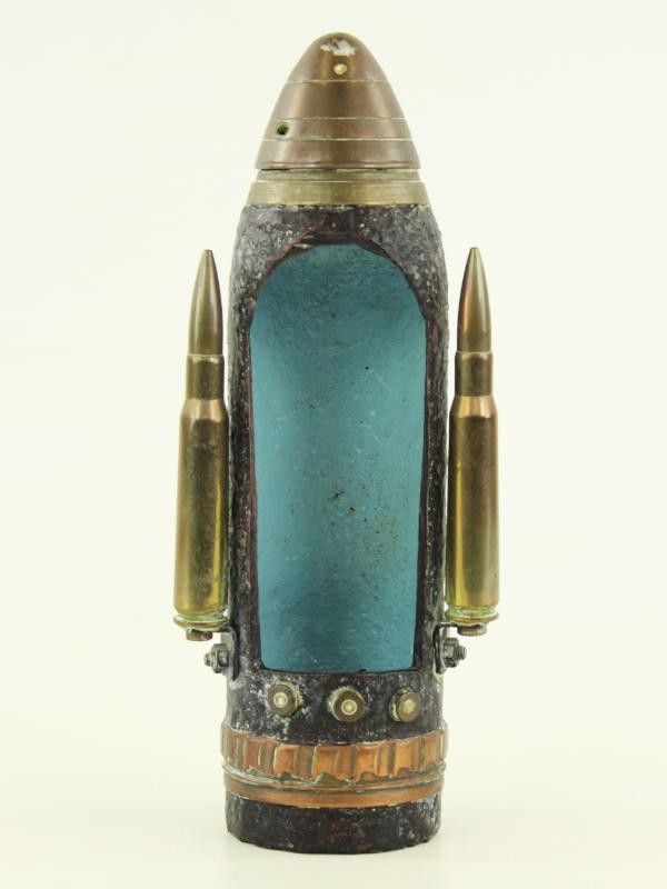 Gemaakt uit een oude brisante granaathuls, kunstig uitgehold en voorzien van twee decoratieve projectielen, vormt dit stuk een indrukwekkend voorbeeld van oorlogskunst gemaakt uit militair materiaal, vaak door soldaten zelf vervaardigd.