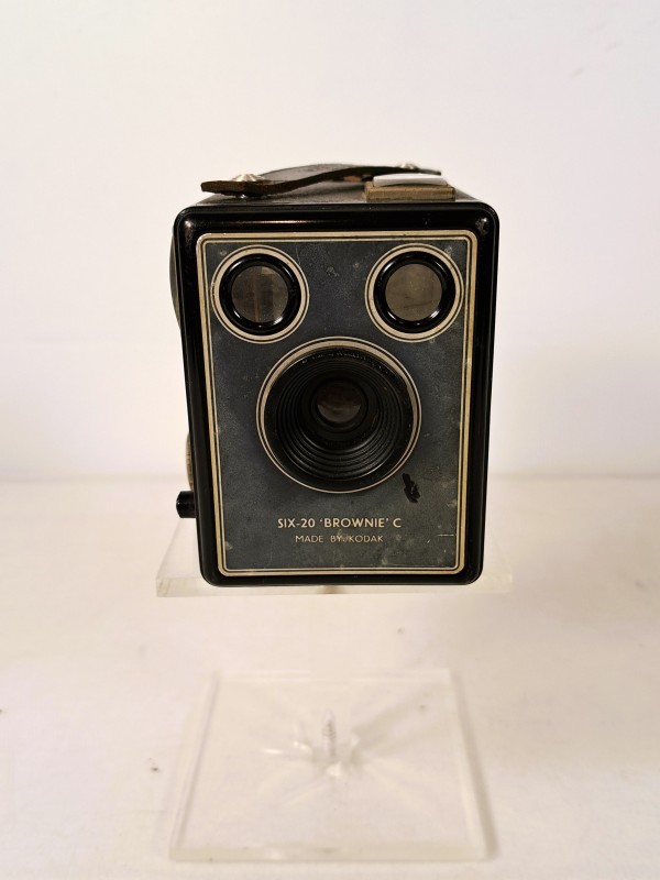 De Six-20 Brownie C is gemaakt door Kodak en kwam rond 1939 op de markt. Deze boxcamera heeft een metalen body met zwarte bekleding. Aan de voorzijde zitten drie ronde lensopeningen in een kenmerkende opstelling. De naam van het model staat duidelijk vermeld op de voorplaat.
