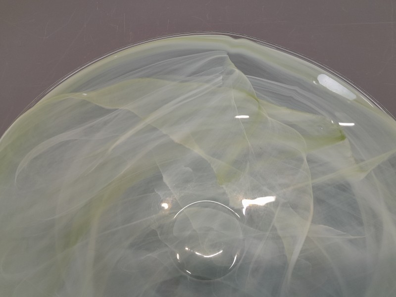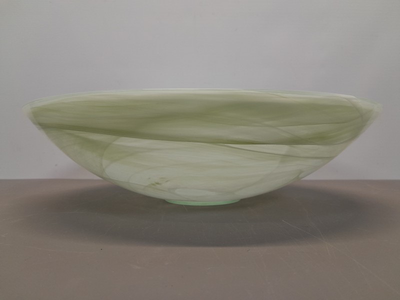 Stijlvolle glazen schaal met een gemarmerd patroon in zachte groen- en wittinten. Vermoedelijk geperst glas. Een decoratief object dat door zijn rustige kleurstelling in veel interieurs past. Ideaal voor dagelijks gebruik of als eenvoudig, sfeervol accentstuk.