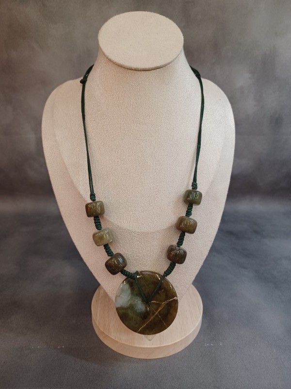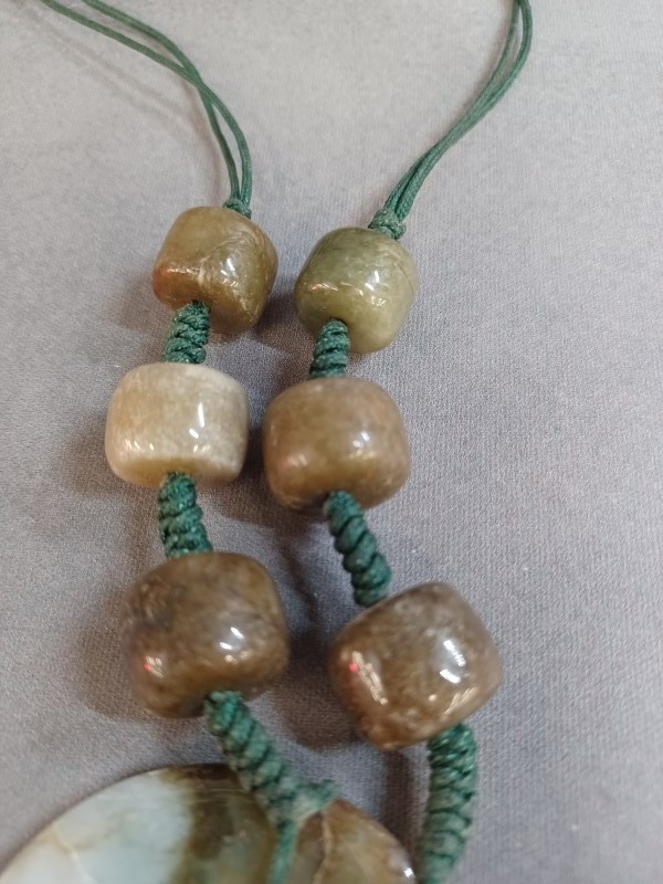 - Aardse materialen: Zowel de hanger als de robuuste, vierkante kralen hebben een uiterlijk dat doet denken aan Jade of een andere natuursteen met een rijke kleurvariatie.