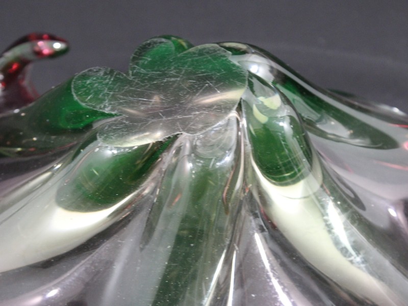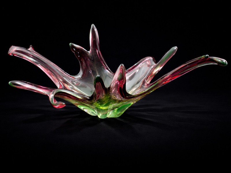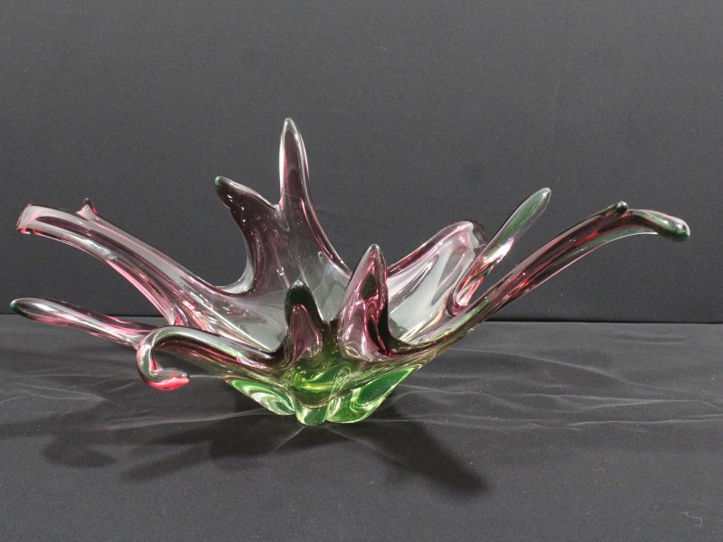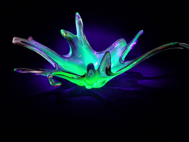 Uniek vormgegeven Murano schaal in uraniumglas. Het bijzondere uraniumglas geeft de schaal een zachte, groenachtige tint die onder UV-licht oplicht met een fascinerende fluorescerende gloed.