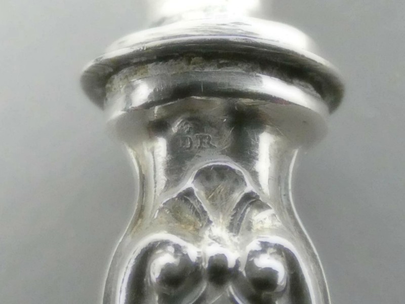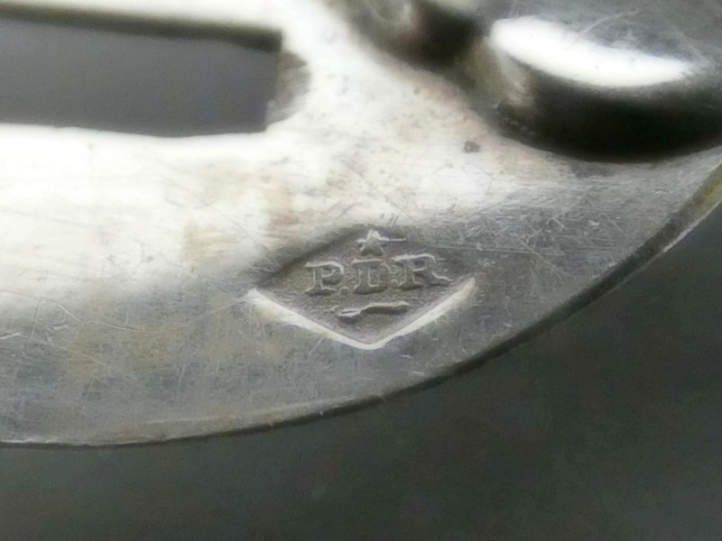De stempels duiden op edelmetaal met een meesterteken (P.D.R.) en mogelijk een waarmerk (kop/hoofd in een zeshoek).