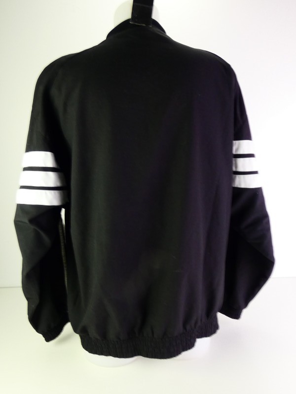 Stijlvol vintage trainingsjack van ADIDAS in klassiek zwart, afgewerkt met de iconische drie witte strepen langs de mouwen en een geborduurd logo op de borst. Het jack heeft een ritssluiting aan de voorkant (modelnummer 3828), praktische steekzakken met metalen Adidas-ritstrekker en elastische boorden aan mouwen en zoom voor een comfortabele pasvorm.