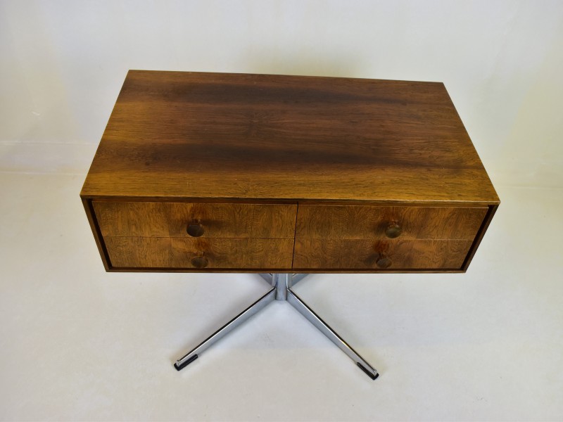 Dit vintage meubel komt uit de jaren 60 of vroege jaren 70. Het heeft een strak en functioneel ontwerp, typisch voor mid-century modern stijl. De kast is uitgevoerd in gefineerd hout met een warme houttekening en staat op een draaibare metalen voet met vier poten. De vier lades hebben ronde houten knoppen en bieden praktische opbergruimte. Dit type meubel werd vaak gebruikt in kantoren of als bijzetkast. De achterkant toont een fineer met opvallende houtstructuur en een groot gat, mogelijk voor kabeldoorvoer of vroegere aanpassing.