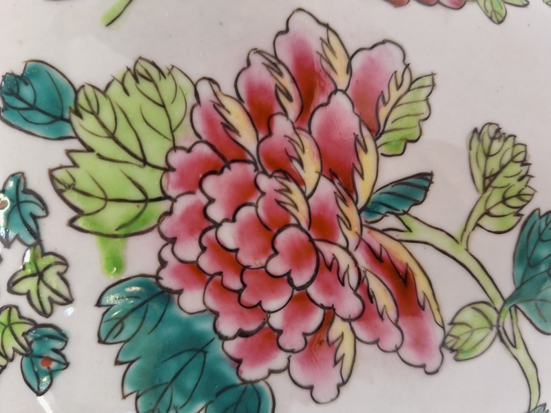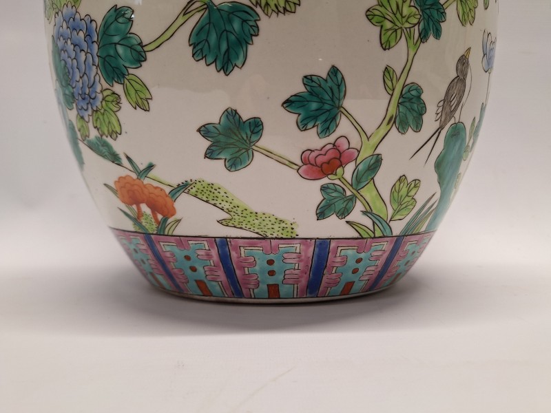 - Stijl: Klassieke "Famille Rose" stijl, herkenbaar aan de heldere kleuren en de verfijnde geometrische banden aan de hals en de voet van de pot.