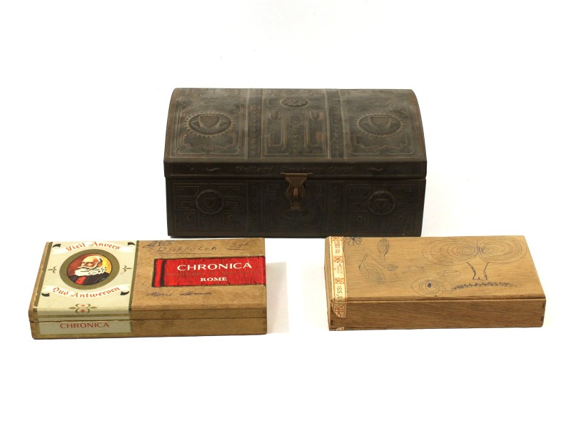 Omvangrijke collectie sigarenbandjes uit het midden van de 20ᵉ eeuw, gepresenteerd in een decoratieve metalen kist met reliëfpatroon en het opschrift Holland Treasure Chest. De collectie omvat honderden kleurrijke bandjes van gerenommeerde merken als Chronica, Mercator, Vander Elst, Willem II en TAF.