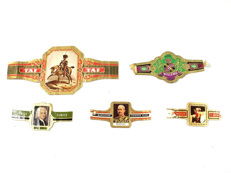 De bandjes vertonen een breed scala aan thema's: heraldische wapenschilden van steden, portretten van historische figuren (Nelson, Piet Hein, Bach), militaire motieven en culturele iconen. De thematische series zijn karakteristiek voor de gouden periode van het sigarenbandjes verzamelen in Nederland en België.