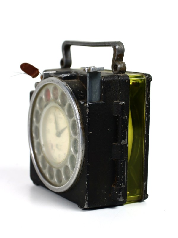 Een prachtige vintage duivenklok, ook wel bekend als een constateur. Dit historische apparaat werd gebruikt in de duivensport om de aankomsttijden van postduiven tijdens wedstrijden nauwkeurig te registreren.