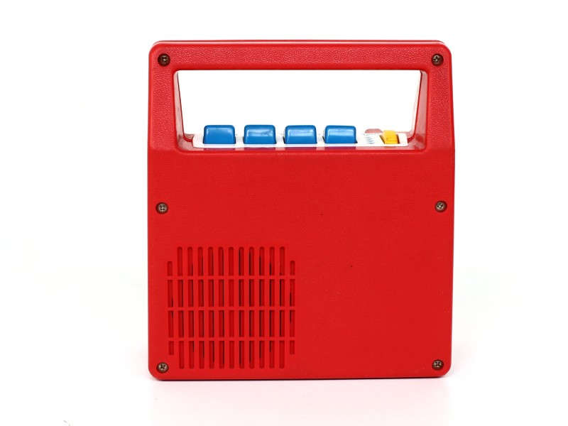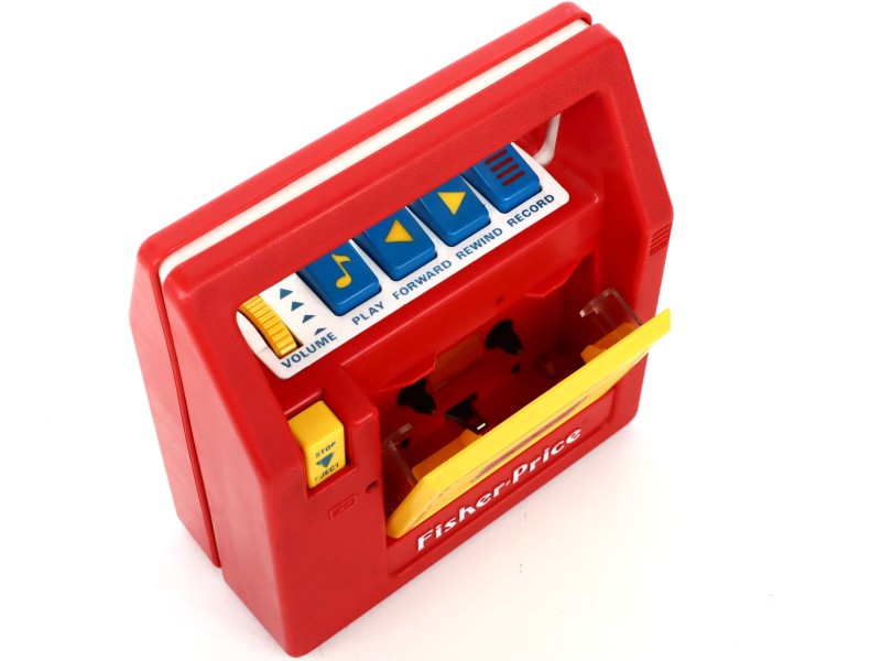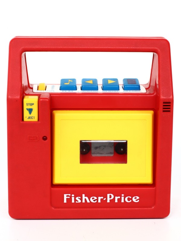 Draagbare vintage Fisher-Price cassetterecorder. Originele Fisher-Price cassetterecorder, in de herkenbare rood-gele uitvoering. Deze klassieker uit de jaren ’80/’90 is een nostalgisch stuk speelgoed én een degelijk werkend audiotoestel. Voorzien van grote, kindvriendelijke knoppen (volume, play, stop/eject, terugspoelen, vooruitspoelen, opname, Engelstalig) en ingebouwde microfoon.