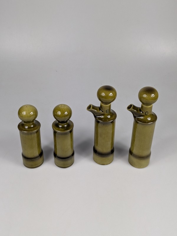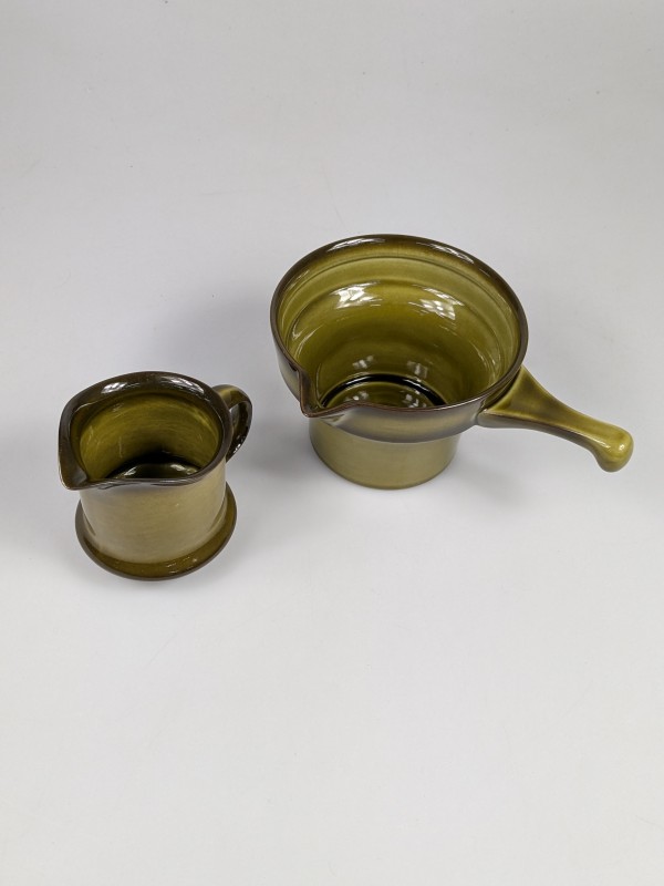 Een prachtige en uitgebreide set groen keramiek servies in vintage stijl. Alle stukken zijn gemaakt van stevig geglazuurd aardewerk met een mooie olijfgroene glans. Ideaal voor liefhebbers van retro servies, landelijke tafeldecoratie of keramiekverzamelaars.