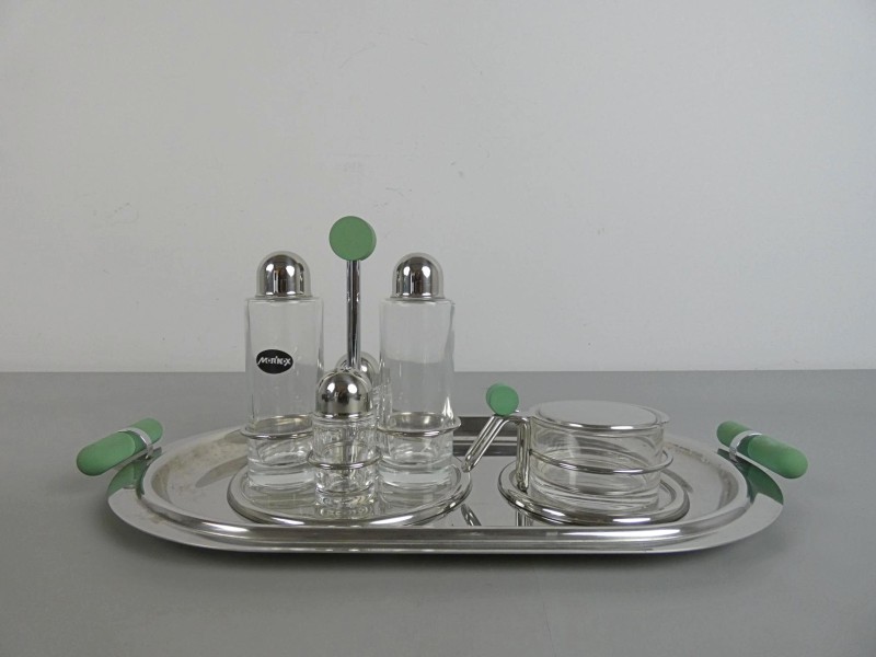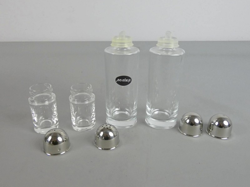 Menage / Tafelset (Olie, azijn, peper, zout en mosterd/suiker) op presentatieplateau.