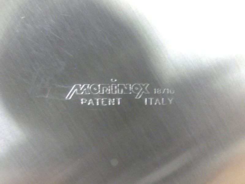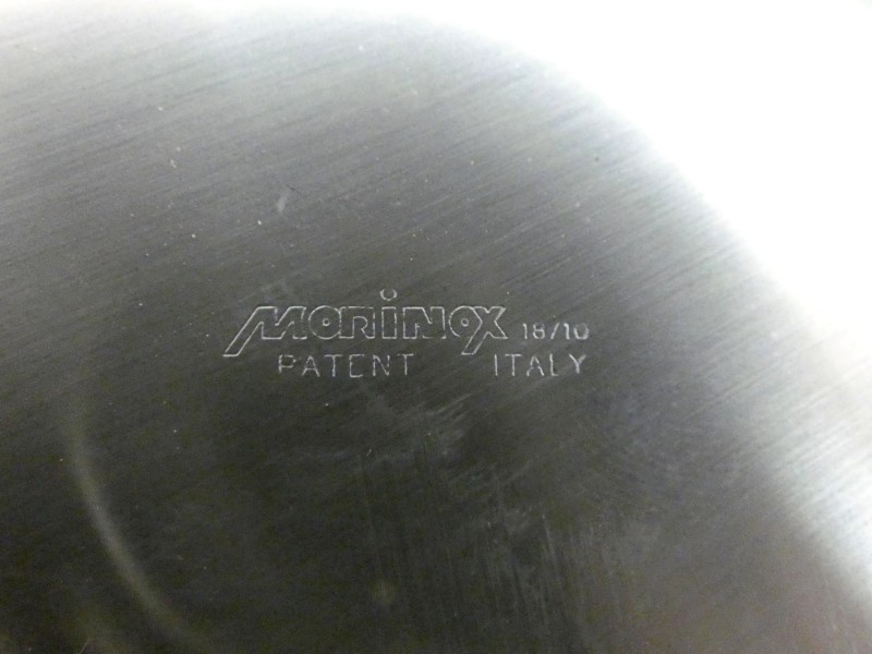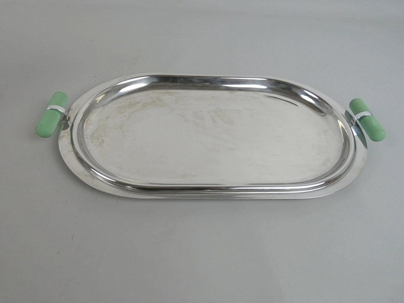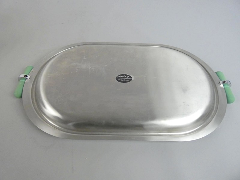 - Zilverkleurig gepolijst metaal met ronde groene handgrepen.