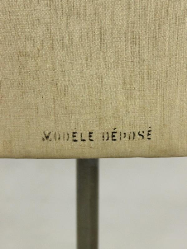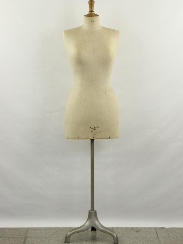 Originele, oude paspop van Juvenia Bruxelles met metalen voet. De stijlvolle paspop heeft een vrouwelijke lichaamsvorm met duidelijke taille, borst en heupen. De romp is bekleed met beige linnen over een stevige vulling. De bovenkant is afgewerkt met een houten knop en de pop staat op een stabiele, metalen voet met drie poten. De pop is aan de voorzijde gemerkt met 'Juvenia Bruxelles 408' en op de achterzijde met 'Modele déposé'. Ook de gietijzeren voet is gemerkt met 'Juvenia Bruxelles'. Waarschijnlijk gedateerd eerste helft 20ste eeuw. Niet verstelbaar in hoogte.