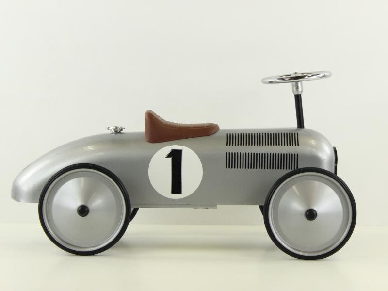Authentieke vintage loopwagen in de stijl van een klassieke Formule 1 racewagen. Dit retro model heeft een stevig metalen frame en een echte oldschool uitstraling die zowel kinderen als liefhebbers van vintage speelgoed zal aanspreken. Geschikt voor jongens en meisjes vanaf 3 jaar en bruikbaar voor binnen-én buitengebruik. Het ontwerp is geïnspireerd op klassieke Formule 1- en Grand Prix-racewagens uit het midden van de 20e eeuw, gekenmerkt door hun gestroomlijnde metalen carrosserie, open wielen en minimalistische, functionele vormgeving.