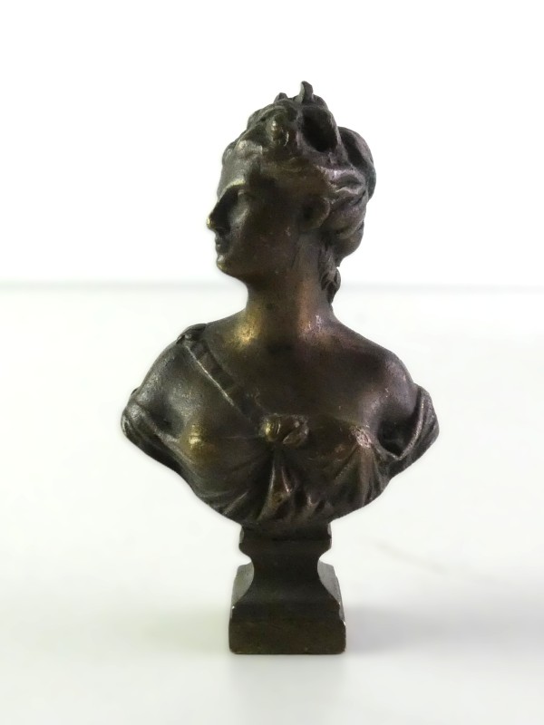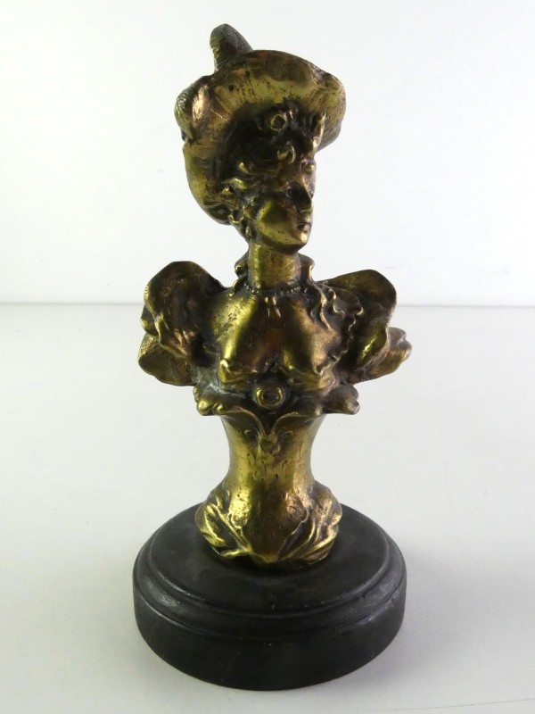 Afm: lengte 3 cm; breedte 3 cm; hoogte 12 cm. - Een bronzen of gepatineerde metalen buste van een vrouw,