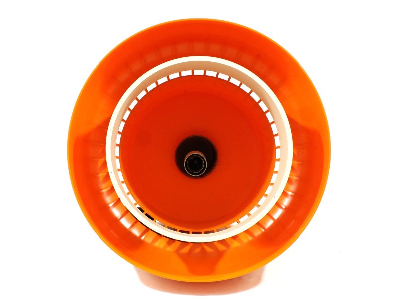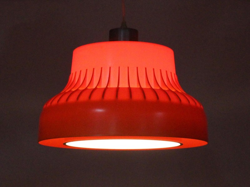 Breng een warme retro-sfeer in huis met deze karaktervolle vintage hanglamp uit de jaren ’60/’70. De lamp ademt duidelijk de Mid-Century Modern stijl, met zijn levendige oranje kap in stevig kunststof en het grafische ribpatroon dat het licht op een speelse manier breekt.