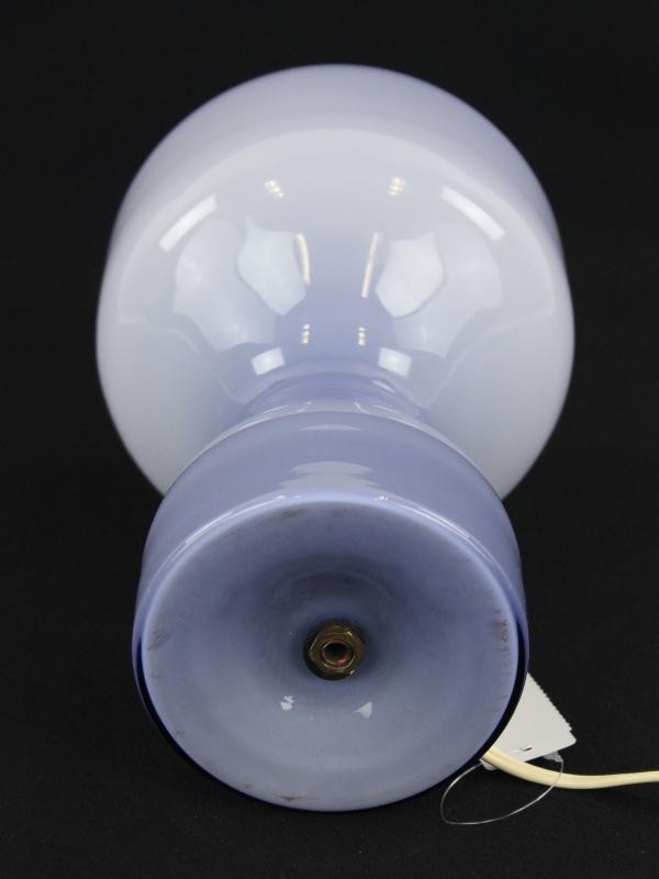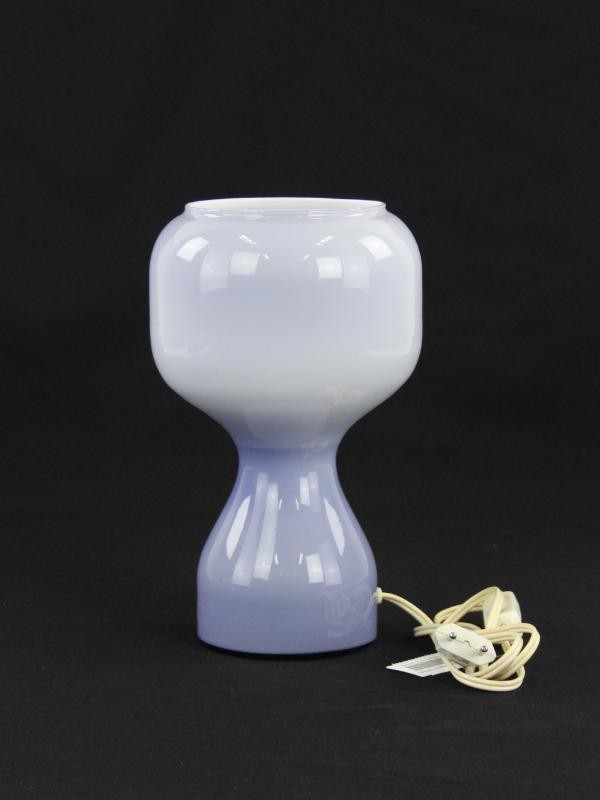 Prachtige vintage tafellamp uit de jaren ’70, vervaardigd uit glanzend opaline glas in een subtiele lavendelblauwe kleurverloop. De sierlijk gevormde voet en bolvormige kap zijn uit één stuk geblazen glas – een herkenbare stijl die sterk doet denken aan de iconische ontwerpen van Frank & Herwig Sterckx voor het Belgische merk Massive.