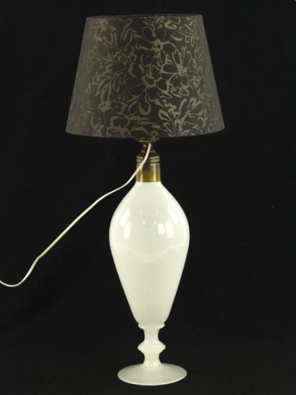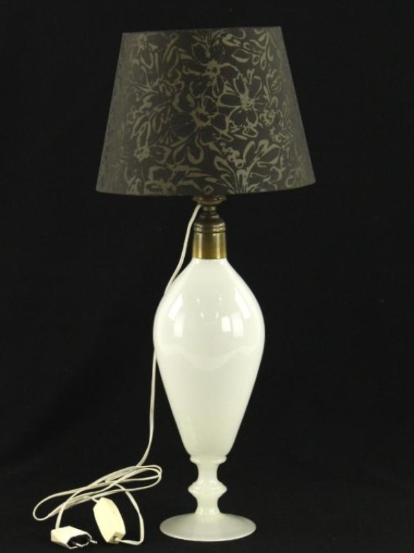 Elegante tafellamp met glazen voet, vervaardigd uit wit opaalglas, met een slanke, vaasvormige body en ronde voet. De lamp is gemonteerd met een messingkleurige fitting (E27) en voorzien van een stoffen lampenkap met florale decoratie op zwarte ondergrond. De kap geeft bij inschakeling een warm, sfeervol licht.