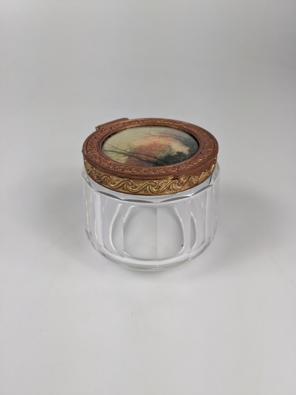 Prachtige vintage poederpot met een geslepen glazen basis en een sierlijk metalen deksel. Het deksel is rijk gedetailleerd met reliëfversieringen en bevat een afbeelding van een klassiek landschap.