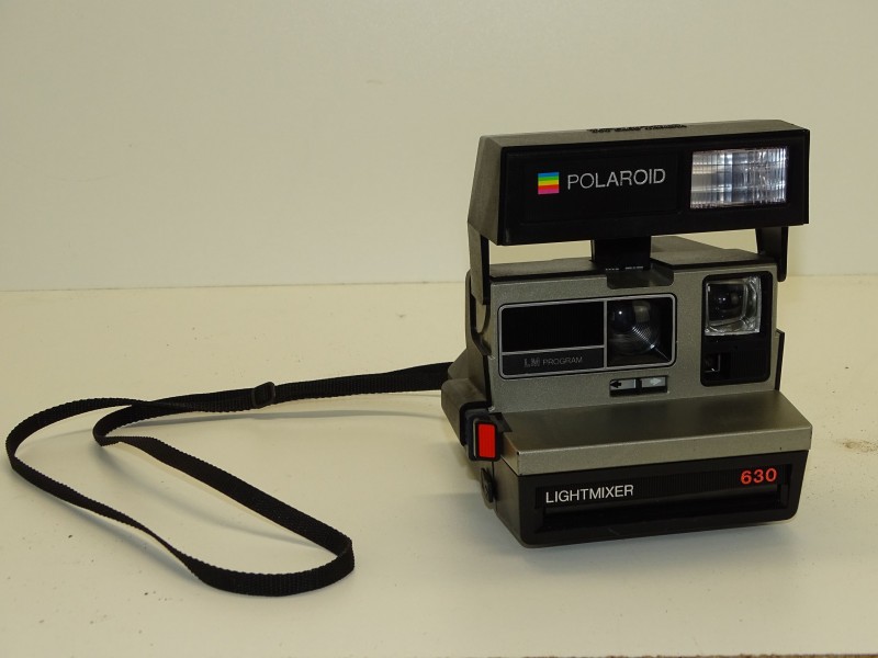 Vintage Polaroid 600 Land Camera met een 630 Lightmixer. Bij deze Polaroid kan de flitser worden ingeklapt. De flitser laadt zich automatisch op via de batterij in de filmcassette. De camera werkt op de gekende 600 film. Deze, voor die tijd, zeer compacte instant camera, de Polaroid 600 is het vlaggenschip van de professionele camera's in het assortiment van Polaroid. De camera heeft een draagriem die je bijvoorbeeld rond de hals kan dragen.