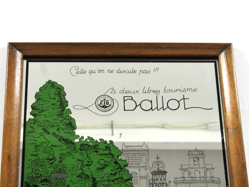 Een sfeervol stukje Franse automobielgeschiedenis voor op de muur. Deze decoratieve reclamespiegel eert het legendarische Parijse automerk Ballot en zijn iconische "La deux litres tourisme" ‒ destijds aangeprezen met de zelfverzekerde slogan "Celle qu'on ne discute pas !!!". Die je niet bediscussieert, voorwaar.