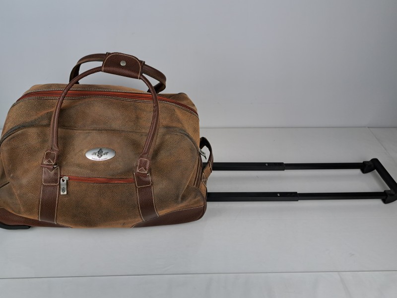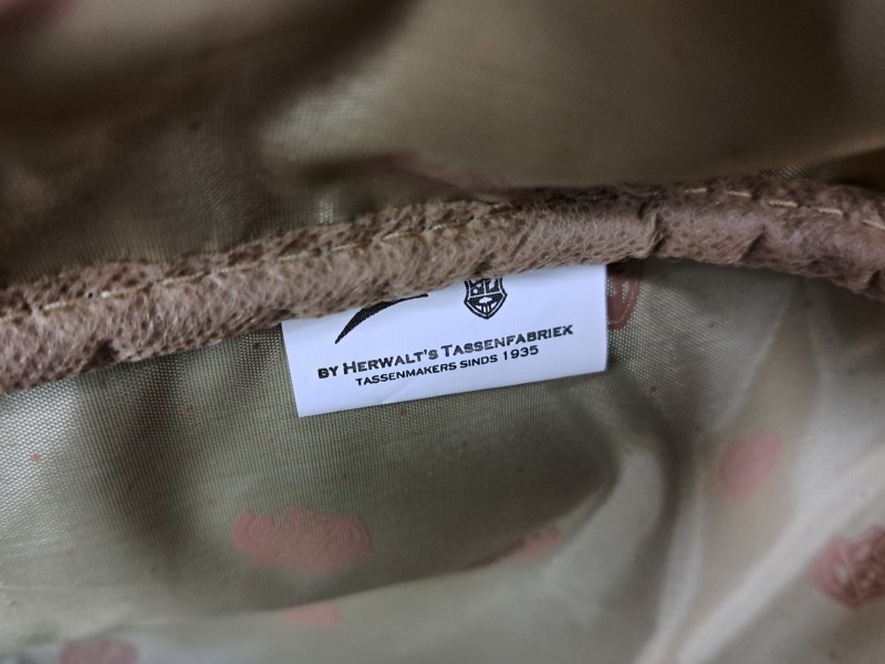 Deze vintage reistas is van het merk Herwalt’s Tassenfabriek, een Nederlands tassenmerk actief sinds 1935. Het gaat om het model “Luxurious Traveler”, herkenbaar aan het metalen logo op de voorzijde. De tas is gemaakt van kunstleer met een reptielstructuur in bruin- en cognactinten. Ze heeft stevige handvatten, een ritsvak aan de voorkant en een hoofdvak met ritssluiting. Dankzij de wieltjes en het zijhandvat is de tas makkelijk te vervoeren. De binnenvoering is bedrukt met het logo van de fabrikant. Deze reistas werd waarschijnlijk gemaakt in de jaren 1990 of begin 2000 en is typisch voor het elegante reisdesign uit die tijd.