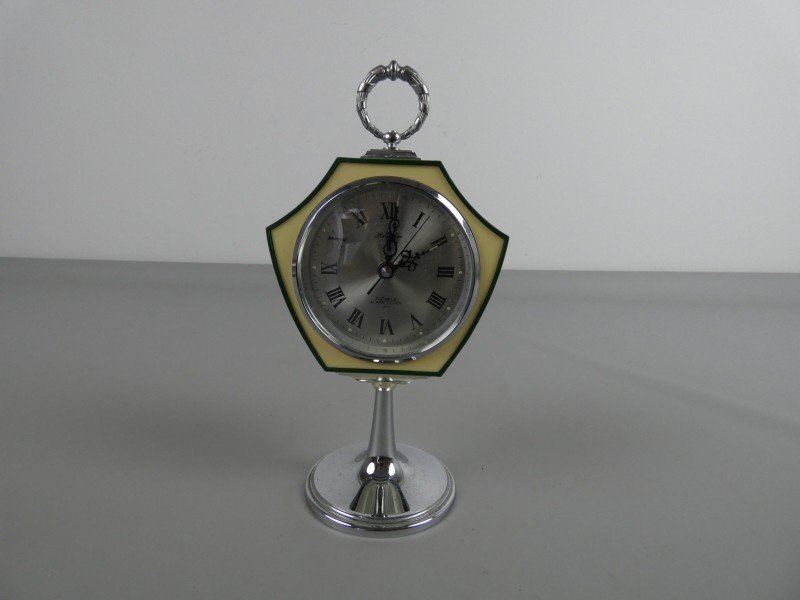 Iconisch Design: Een zeldzame en stijlvolle wekker van Rhythm, Made in Japan, met een onmiskenbaar "Space Age" ontwerp uit de jaren '70. De klok staat op een elegante chromen sokkel met een brede voet.