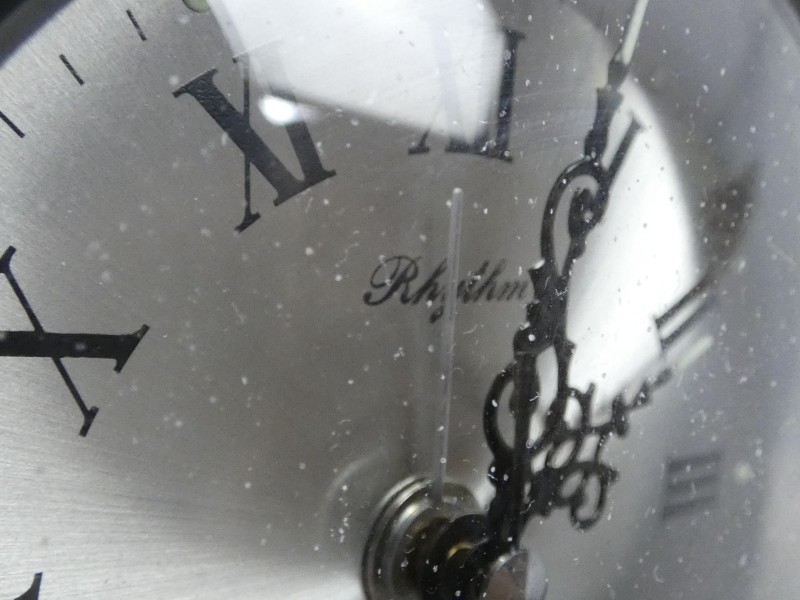 Wijzerplaat: De wijzerplaat is zilverkleurig met duidelijke zwarte Romeinse cijfers en is gemarkeerd met de tekst "Rhythm," "2 JEWELS," en "ALARM CLOCK JAPAN."