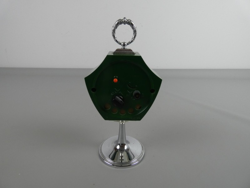 Kleur en Vorm: De behuizing heeft een opvallende donkergroene, zeshoekige vorm met een crèmekleurige rand aan de voorkant. De chromen afwerking van de sokkel en de decoratieve ring aan de bovenzijde benadrukken de retro-look.