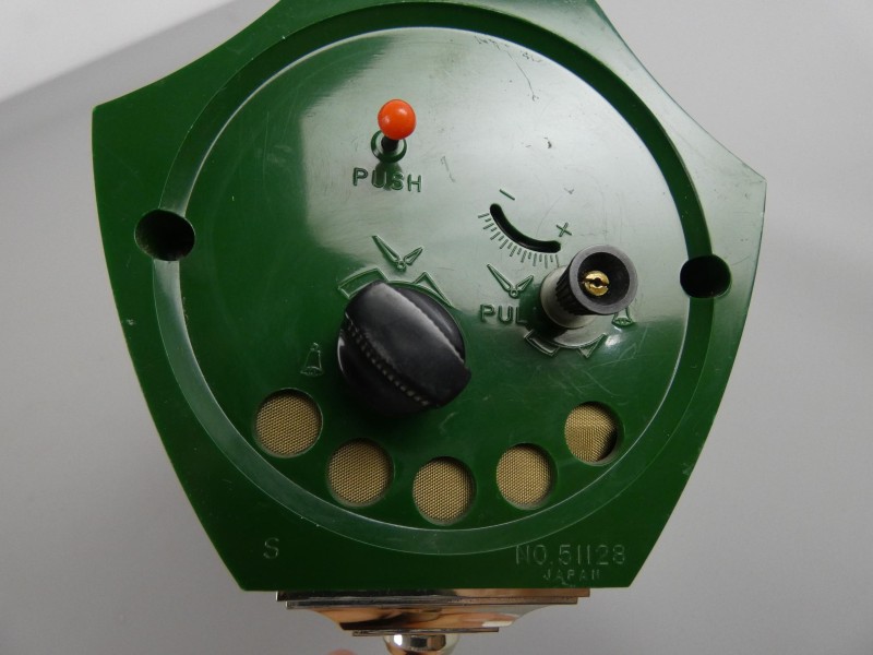 Details Achterkant: De achterkant van de groene behuizing bevat de bedieningselementen voor de wekker en tijd, waaronder een opwindknop en een rode alarm-uitschakelknop ("PUSH"), met het modelnummer NO. 51128 JAPAN. De wekker beschikt over een mechanische belsignaal.