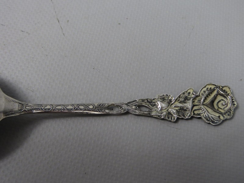 Vintage set van een Hildesheimer Rose taartschep, gemaakt in Duitsland, gemarkeerd met Antiko 100 en een verzilverd suikerlepel met Hildesheim roos, fabrikant onbekend, alleen “100” is op de achterkant gestempeld om de verzilvering aan te geven. Deze kan ook dienen als jamlepel - theelepel - slagroomlepel. Beide stukken zijn versierd met rozenmotieven op de handvatten en randen.