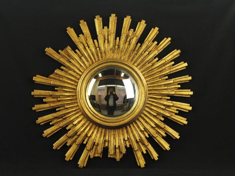 Het bolle spiegelglas geeft een licht vervormde weerspiegeling, wat kenmerkend is voor dit type spiegel. Rond het glas zit een eenvoudige ronde rand die overgaat in het uitgesproken stralenvormige kader.