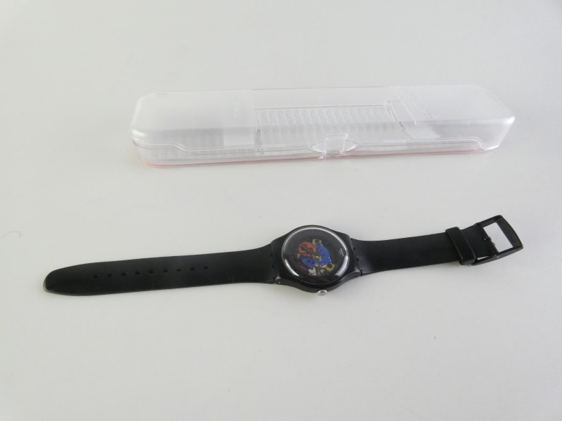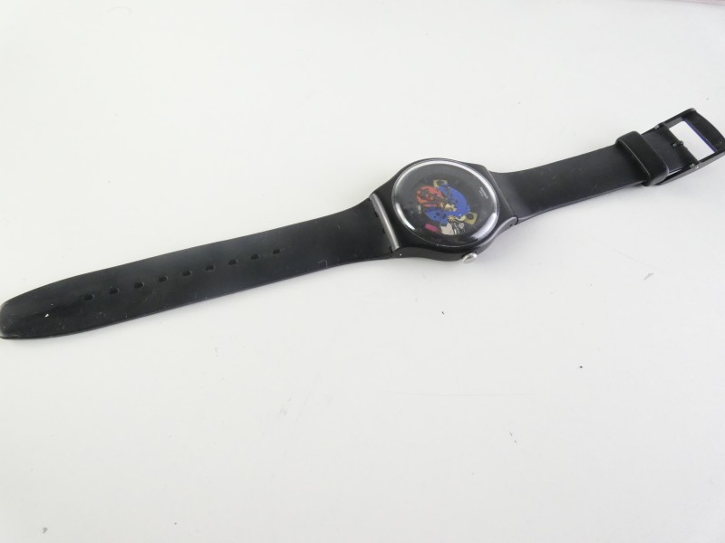 Twee kunstzinnig vormgegeven vintage Swatch-horloges met karakteristieke wijzerplaten, daterend uit de jaren ’80–’90. Beide horloges zijn voorzien van een kunststof kast en een zwarte rubberen band.