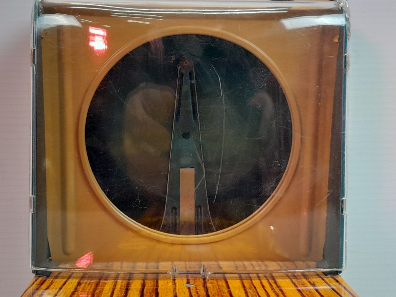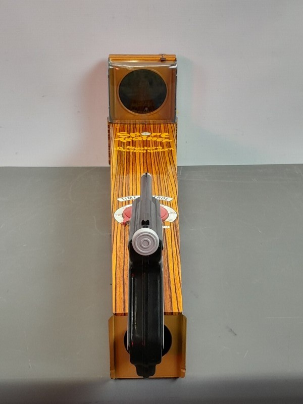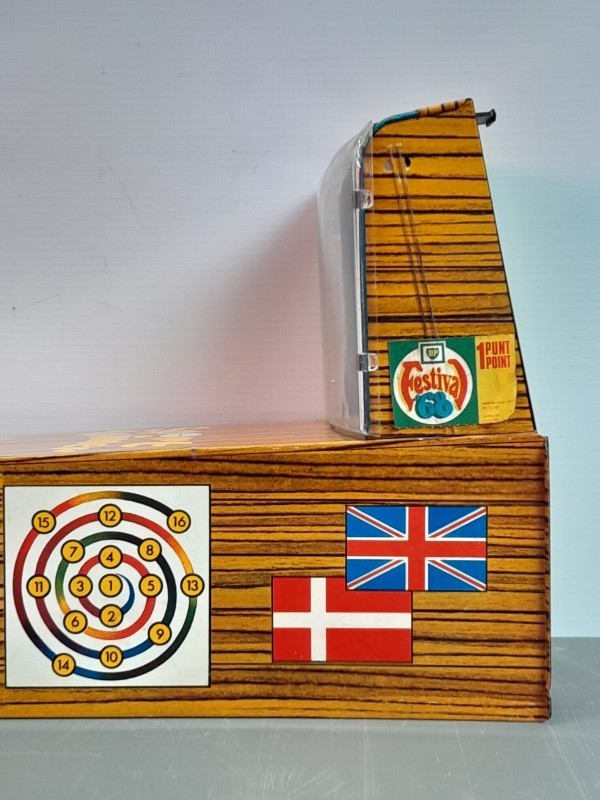 Dit vintage schietspel combineert een karakteristiek jaren-60/70 ontwerp met een leuk optisch doelmechanisme. De houtnerf-look, kleurrijke internationale vlaggen en retro-vizierkast geven het geheel een opvallende uitstraling. Een bijzonder decoratief en nostalgisch verzamelitem dat perfect past binnen een collectie tin toys of klassieke elektronische spelletjes.