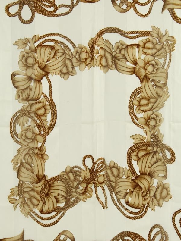 Het ontwerp toont een symmetrische compositie van linten, strikken en bloemenkransen in warme beige- en bruintinten, afgezet tegen een frisse witte achtergrond. Dat kleurcontrast zorgt voor een evenwicht tussen warmte en lichtheid, wat de sjaal een tijdloze en veelzijdige uitstraling geeft.