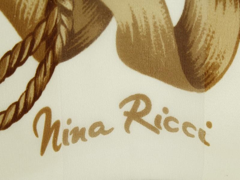 De zijde voelt zacht en soepel aan, met een natuurlijke glans die de kwaliteit van het materiaal benadrukt. De sjaal is in de hoek gesigneerd met het kenmerkende Nina Ricci-logo, een teken van authenticiteit en verfijnd vakmanschap.