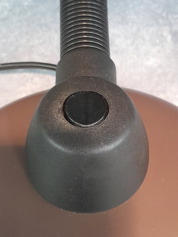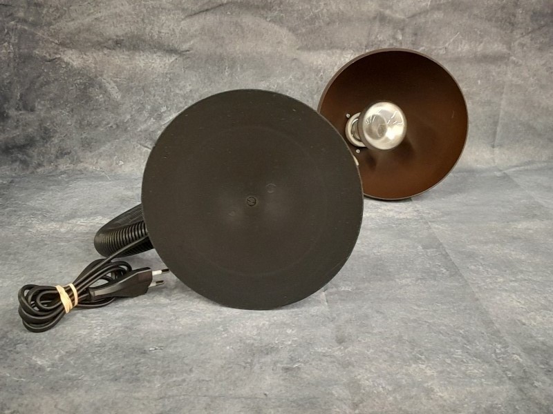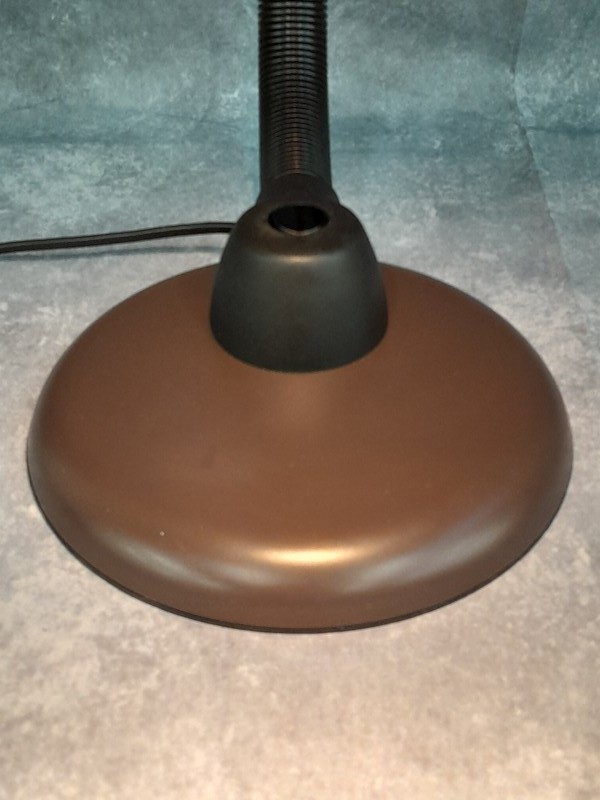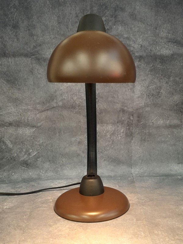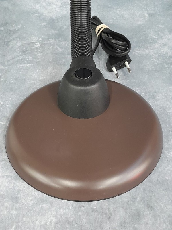 - De lamp heeft een ronde aluminium lampenkap en bijpassende voet, beide bruin geschilderd aan zowel de binnen- als buitenzijde, wat zorgt voor een warme en stijlvolle uitstraling.
