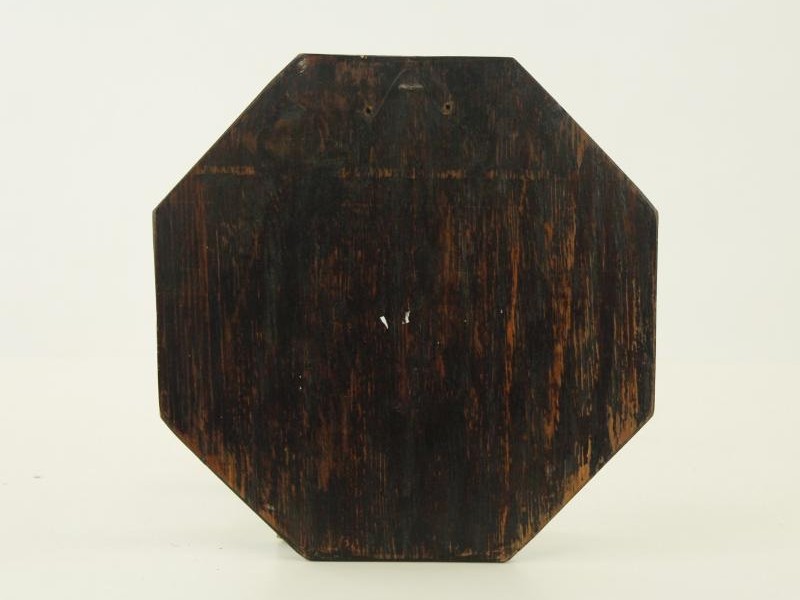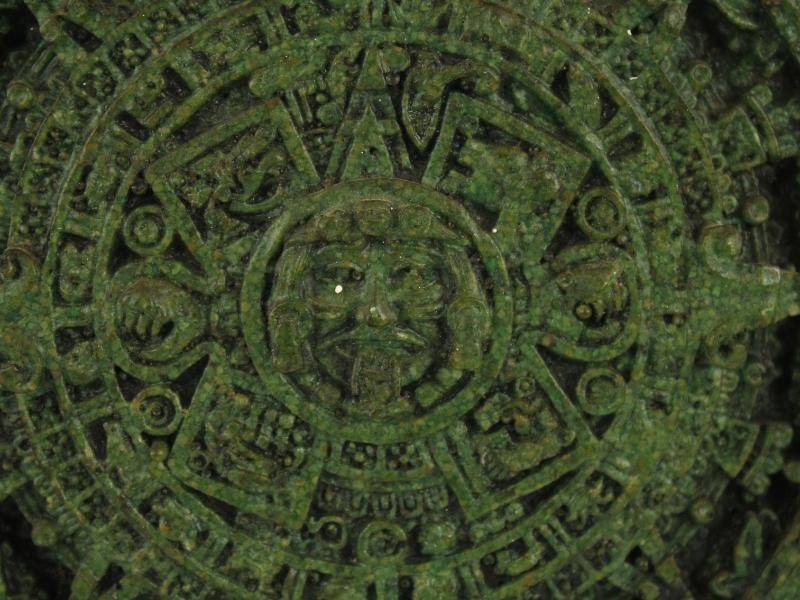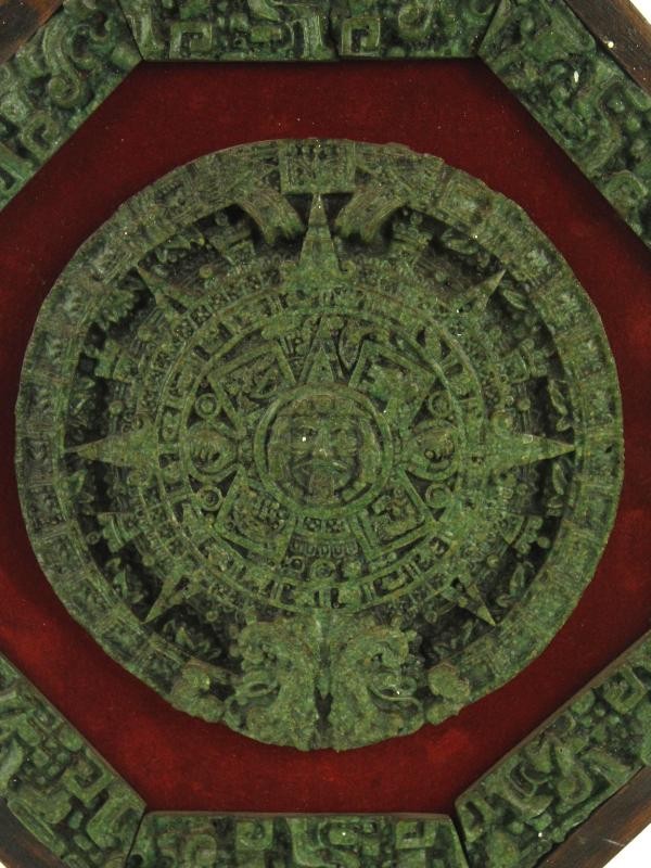 Wanddecoratie met replica van een Azteekse kalender. De Azteekse kalender bestond uit een cyclus van 365 dagen en een cyclus van 260 dagen voor rituelen. De kalender bestaat uit een reliëf uit groen resin aangebracht op een houten, zeshoekige plaat, bedekt met rood vilt.