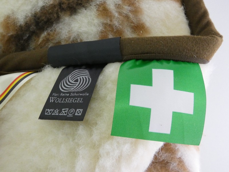Gemaakt van 100% zuivere scheerwol (Wollsiegel-label, natuurhaar), dubbelzijdig uitgevoerd en van een mooie, dikke kwaliteit. Afgewerkt met een elegante bruine bies. De deken verkeert in zeer goede staat – perfect voor koude avonden of als luxe plaid op bed of bank.